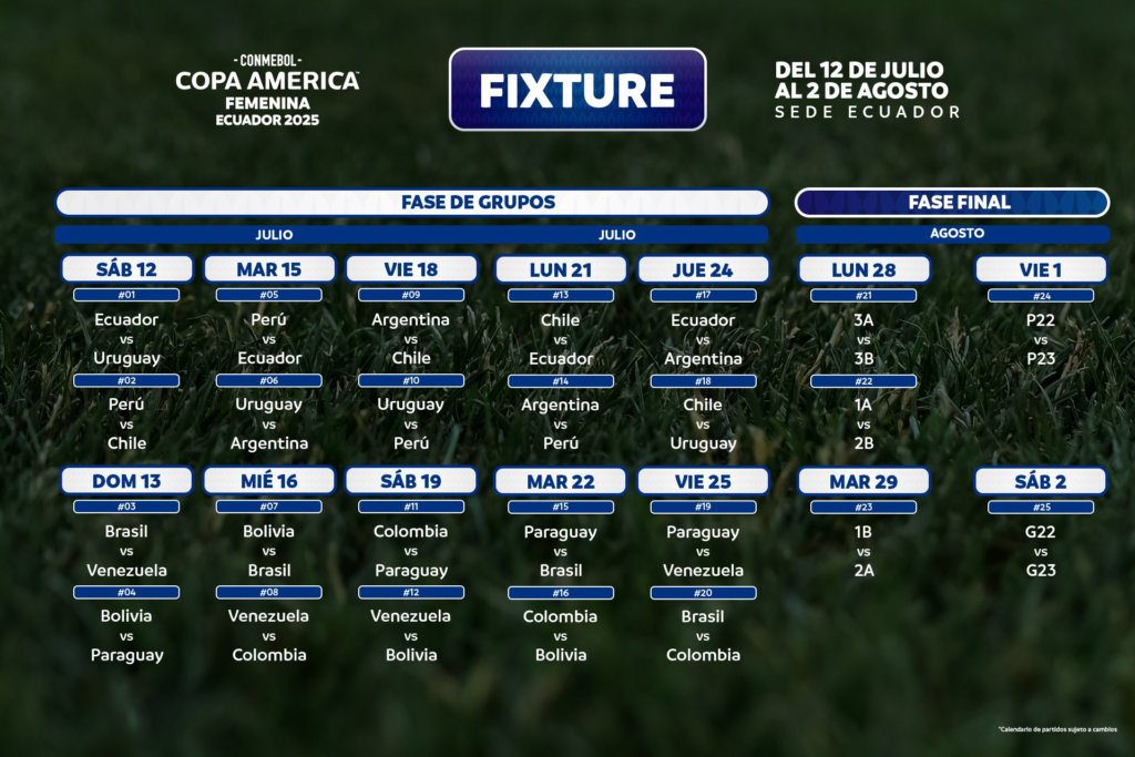 La Selección Argentina integrará el Grupo A junto con Ecuador, Chile, Uruguay y Perú, tras realizarse este jueves el sorteo de la Copa América Femenina 2025 que, en su novena edición, se disputará en Ecuador del 12 de julio al 2 de agosto. Por su parte, el Grupo B estará compuesto por Brasil, Colombia, Paraguay, Venezuela y Bolivia.