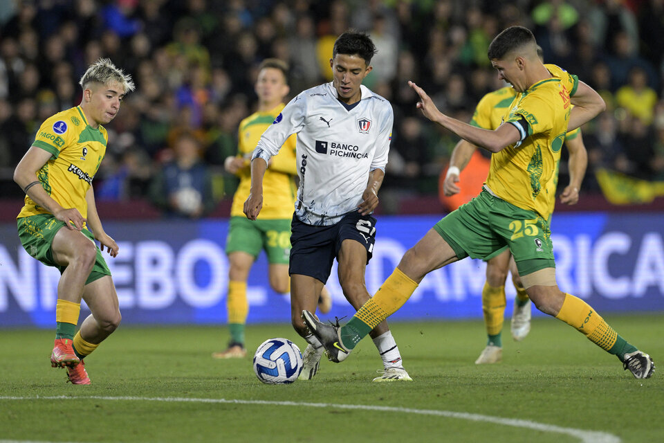 Defensa estuvo muy cerca de abrir el marcador cuando iban apenas cinco minutos, pero el remate de Gastón Togni se fue besando el palo. Aquella acción pudo encaminar la hazaña del Halcón, que atacó y atacó durante la primera parte el arco custodiado por el exVélez y Colón Alexander Domínguez. De todas maneras, las más claras la tuvo Liga, con muchos espacios para jugar de contraataque pero sin puntería.