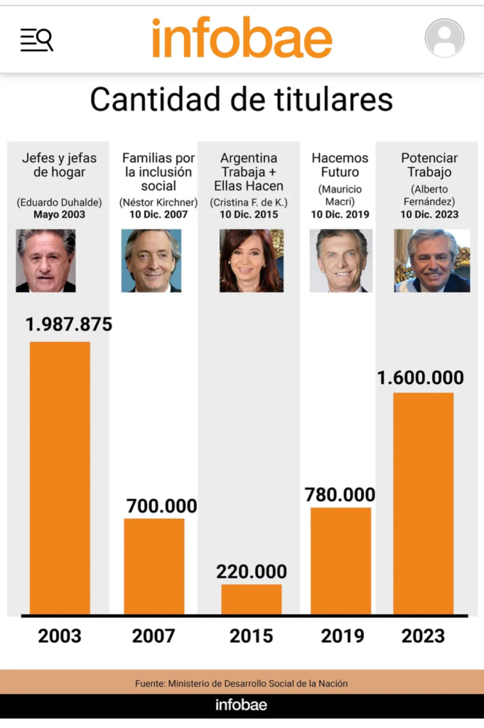 Al igual que CFK, mencionó el cuadro publicado por Infobae y dijo que los planes sociales fueron “producto de la crisis del 2001 y sugeridos por el Fondo Monetario Internacional”. Cuando terminó la gestión de Néstor Kirchner “y a raíz de las cooperativas”, recordó, “se llegó a 700.000 planes sociales”, mientras que “durante las dos gestiones de Cristina Kirchner esto se bajó a 220.000 planes”, detalló el senador.