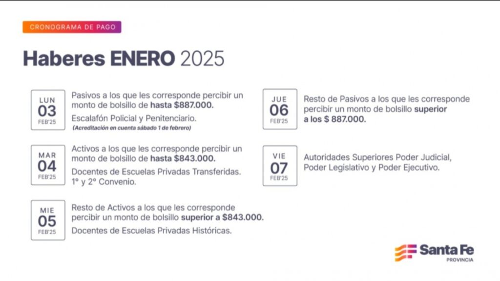 El Gobierno provincial, a través del Ministerio de Economía, informó que los haberes del mes de enero se percibirán a partir del lunes 3 de enero hasta el viernes 7. Los pasivos a los que les corresponde percibir un monto de bolsillo de hasta $ 887.000, junto con el escalafón policial y penitenciario, verán acreditado sus haberes en cuenta el sábado 1.