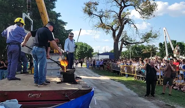 Para ello las fundiciones locales se unieron y prepararon el material metálico que fue vertido al rojo vivo en un molde a la vista de los vecinos, para confeccionar una placa recordatoria.