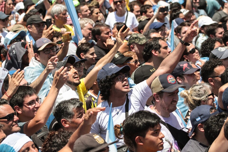 La antipolítica fue el sello del día. Si bien se vieron banderines libertarios -los amarillos con una serpiente y la advertencia “No me pises”- y remeras con el dibujo de un león y el slogan Milei 2023, predominaron las banderas y remeras argentinas. En lugar de batucadas, el sonido que se escuchó en la plaza fue el de las trompetitas de plástico del merchandising del mundial de fútbol.