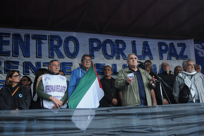 Entre los dirigentes gremiales que participaron del evento estuvieron Juan Carlos Schmid (CATT), Roberto Baradel (Suteba), Juan Pablo Brey (Aeronavegantes), Hugo “Cachorro” Godoy (Asociación de Trabajadores del Estado) y Alejandro Gramajo (Unión de Trabajadores de la Economía Popular), entre otros. “Lo que está sucediendo es un genocidio nunca antes visto”, dijo a Página/12 Roberto Pianelli, secretario general de Metrodelegados.