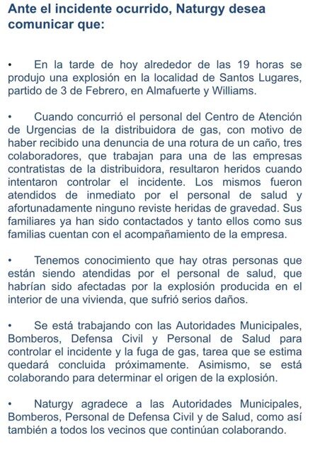 “Cuando concurrió el personal del Centro de Atención de Urgencias de la distribuidora de gas, con motivo de haber recibido una denuncia de una rotura de un caño, tres colaboradores, que trabajan para una de las empresas contratistas de la distribuidora, resultaron heridos cuando intentaron controlar el incidente”, relató Naturgy en una nota que compartió el intendente Diego Valenzuela.