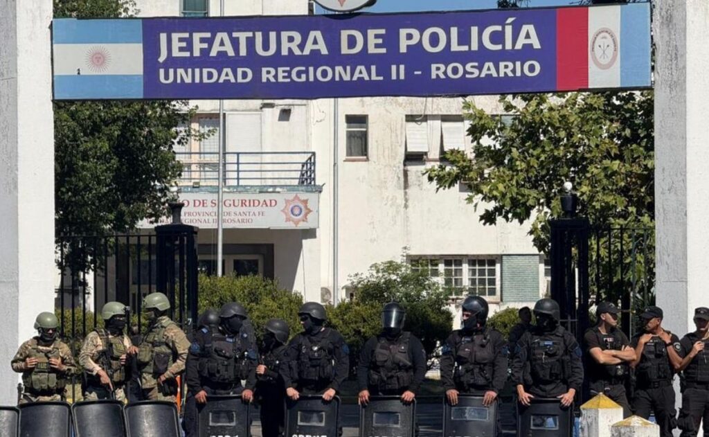 En pleno desarrollo de la protesta, también acompañada de familiares y allegados a los agentes, la protección del edificio de la Unidad Regional II quedó a cargo de las fuerzas del Servicio Penitenciario de Santa Fe (SPSS) y las TOE (Tropas de Operaciones Especiales).