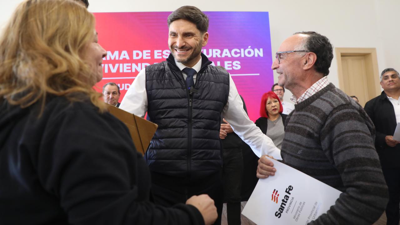 En el marco del Programa de Escrituración de Viviendas Sociales, el gobernador Maximiliano Pullaro entregó este jueves 174 escrituras traslativas de dominio y de regularización y titularización de viviendas Fonavi a familias de 17 barrios de la ciudad de Santa Fe.