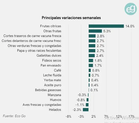 Las frutas también encabezaron las subas, con un salto del 5,7%. En este grupo, las frutas cítricas aumentaron 14% y las otras frutas 5,3%, compensando la leve caída de la manzana (-0,3%). Las verduras avanzaron 2,3%, destacándose la papa y otras verduras frescas.