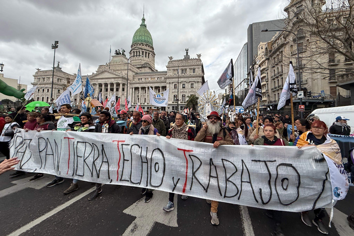 En un mediodía frío, subidos a un tractor, el padre Toto de Vedia junto a dirigentes de la Unión de Trabajadores de la Economía Popular entraron a la plaza encabezando la protesta. Atrás se vió un grupo de cocineras comunitarias, empuñando cucharones, con coloridos pañuelos en la cabeza, y una cuadrilla de trabajadores de la urbanización de los barrios populares. Y, finalmente, a la pancarta que hizo de cabecera de la marcha: en la larga bandera se leía la consigna del día, “Paz, pan, tierra, techo y trabajo”.