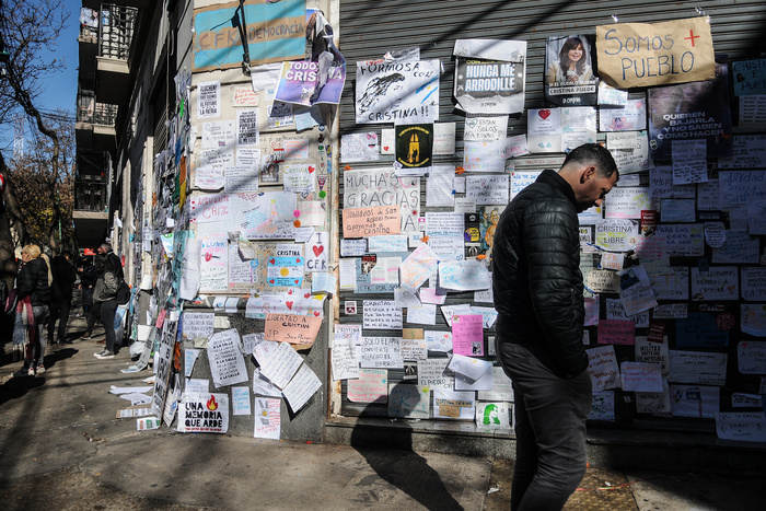 La esquina empapelada se puede ver entrando por Humberto Primo o por San José desde Carlos Calvo. Con una altura que alcanza los dos metros, carteles con leyendas y fotos cubren la ochava sobre la que vive la expresidenta Cristina Fernández de Kirchner. Cientos de mensajes pegados sobre la cortina de un local cerrado y otros avanzando sobre las paredes. Y si se camina atento, por todas las calles que desembocan en ese centro por donde pasa estos días la política nacional, se encuentran adelantos de estos “altares” en paredes de la Facultad de Ciencias Sociales de la UBA y de casas abandonadas. El de la Facultad es una serie de fotos con consignas contra la proscripción decoradas con corazones de cartón que hacen de sostén de los otros carteles. Y si se llega caminando por Humberto, hasta sobre el asfalto hay una imagen de cinco metros de Cristina Kirchner hecha con tizas de colores sobre el negro betún.