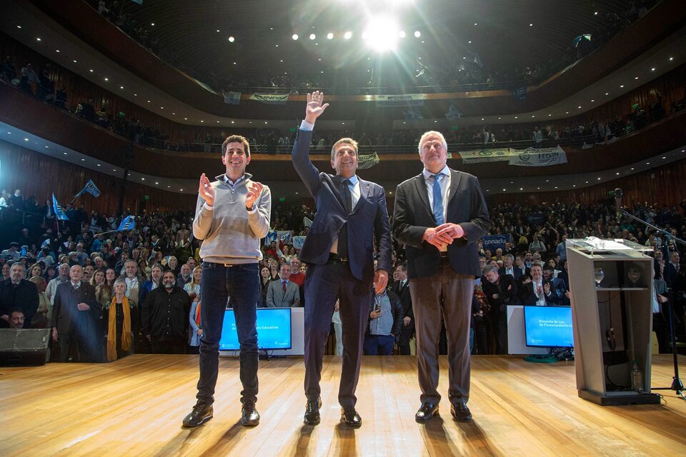 Ante funcionarios, gobernadores, legisladores, dirigentes gremiales, estudiantes y rectores universitarios de distinto origen político, Massa invitó a todos a “defender en el Congreso” el proyecto de una nueva Ley de Financiamiento Educativo, que ante una oposición de derecha “que desprecia la educación pública” y quiere hacer recortes, “les diga en la cara que eligieron el ajuste para cerrar sus programas económicos”.